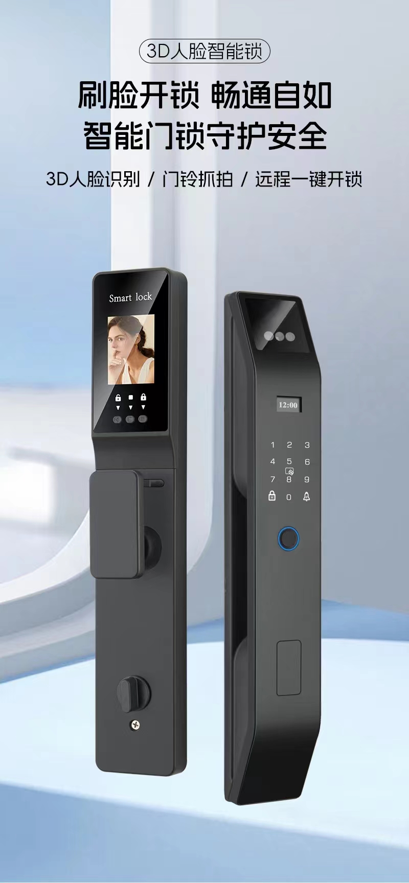 执手款智能锁:人脸识别、指纹、密码、远程控制,可视门铃 ┈┈┈...